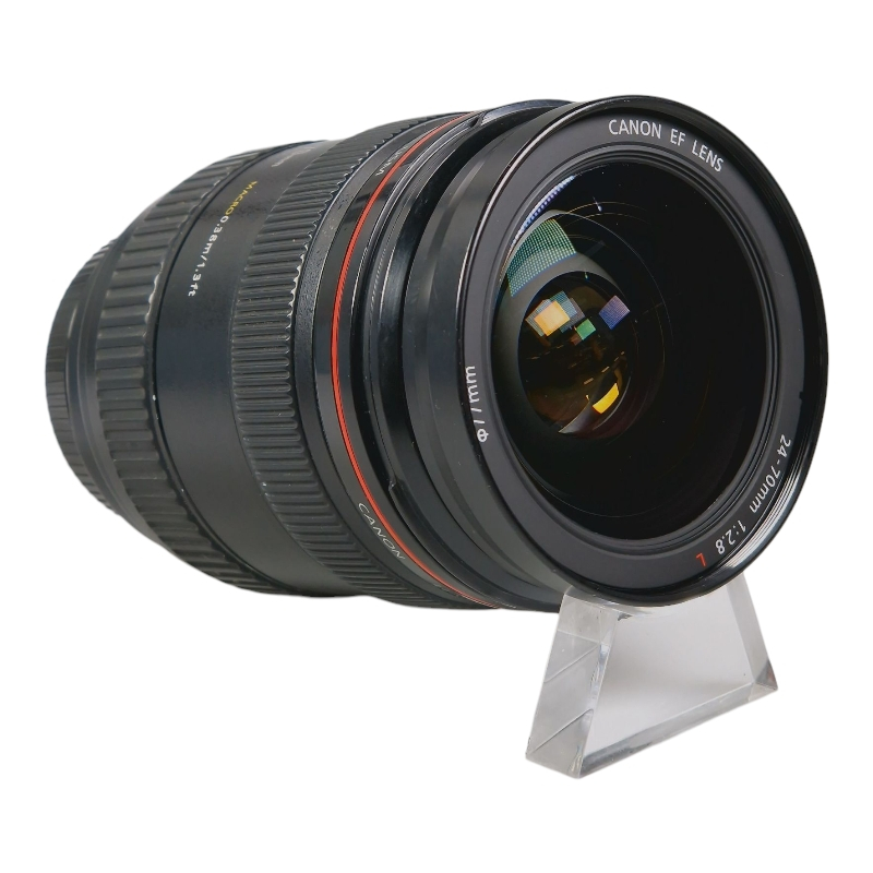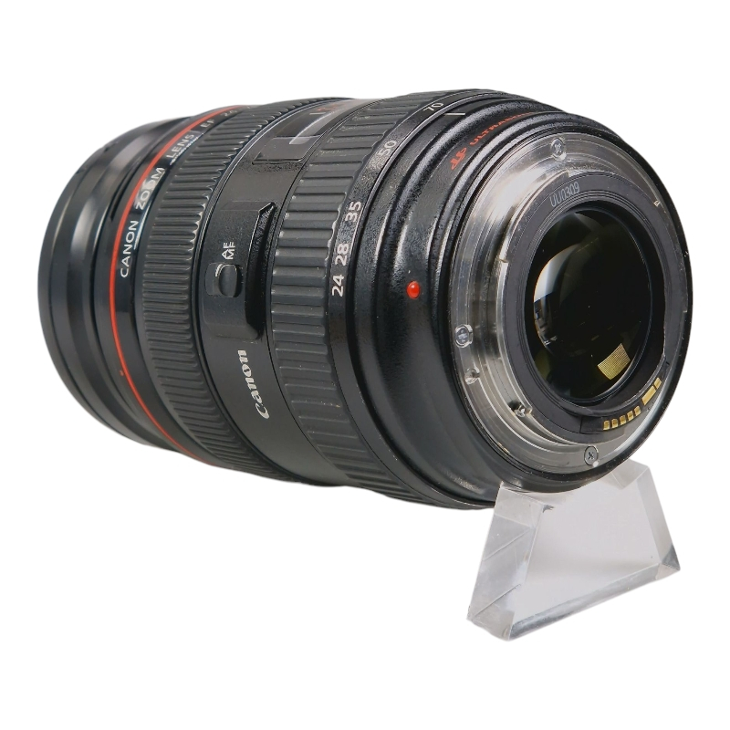 Checked and cleaned Canon L series zoom lens. In very good condition. Has some cosmetic wear. This fast aperture, professional-level lens is suitable for a wide range of photography, from portraits to documentary images, even in low light.
