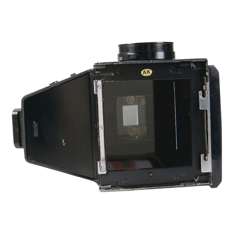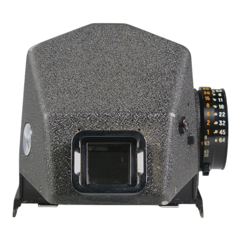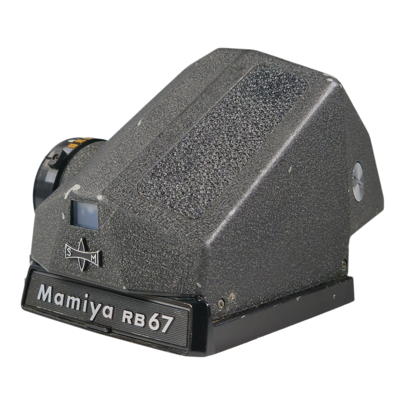 A metered prism finder for Mamiya RB67. Finder image is clean and clear and meter appears to meter at least roughly correctly. Some cosmetic wear and signs of ageing.