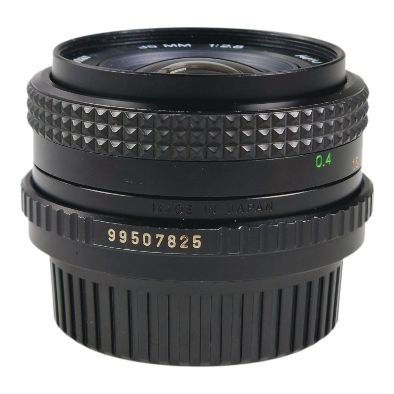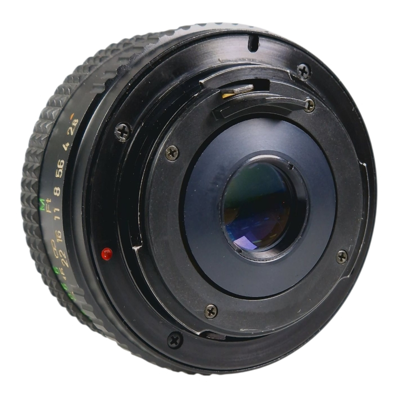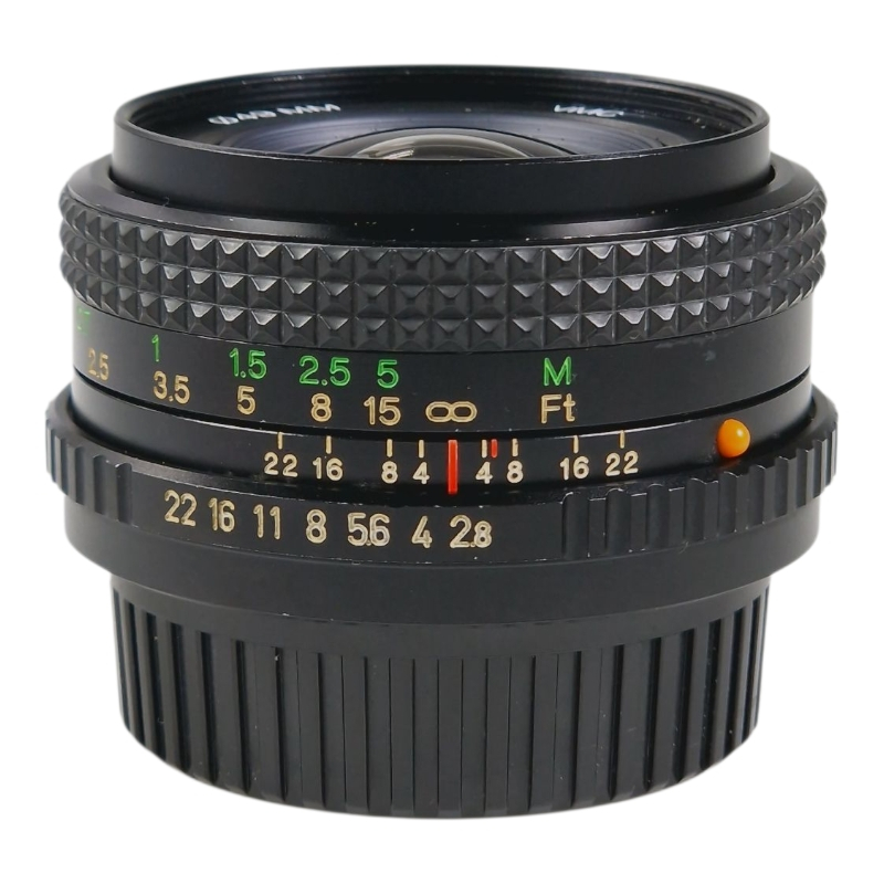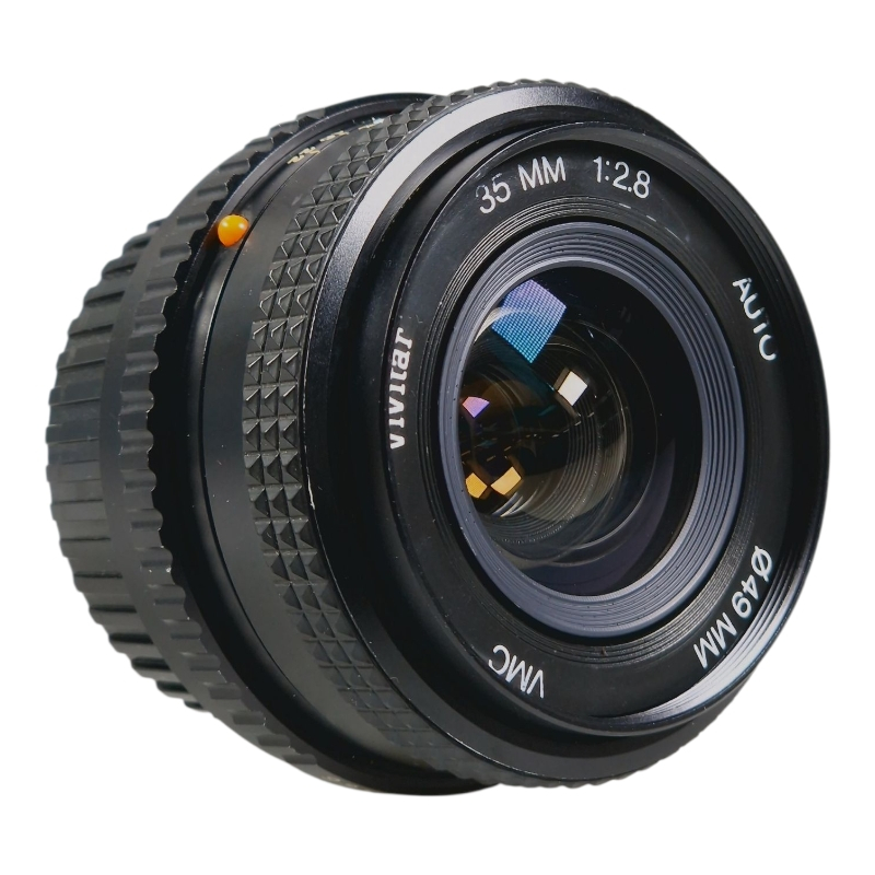 Vivitar's semi-wide angle lens for Pentax K mount. In very good condition. Focusing is dry and feels a bit loose, but adjusts evenly and without slack. Aperture is clean and snappy, optics are tidy and scratch-free. Rear lens cap is included.