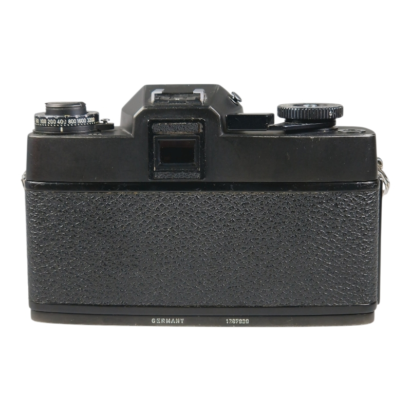 Leica film SLR from the mid-1970s. Check and clean serviced, all working well. Shutter speeds all on point, meter is working properly. Apparent cosmetic wear and patina. Focusing screen / finder has a few tiny dust specs, but these do not affect use in any way.