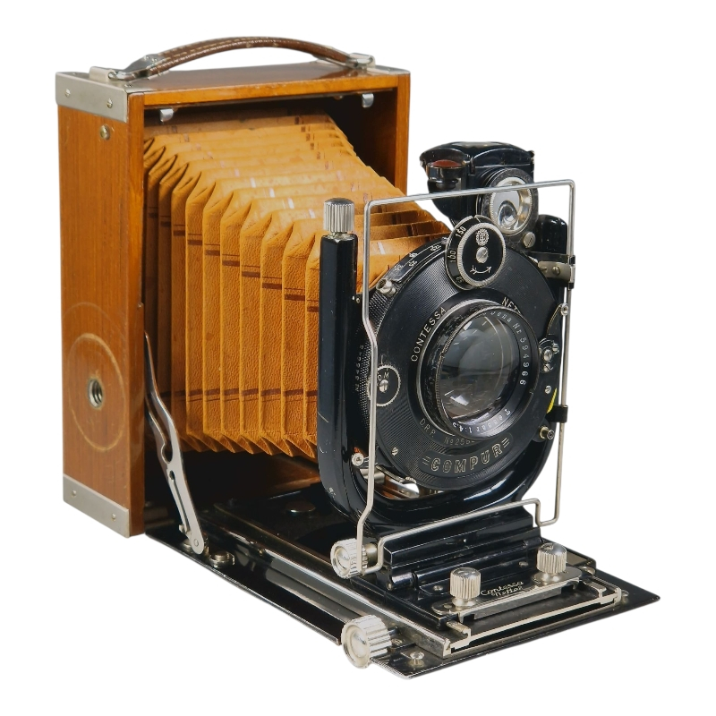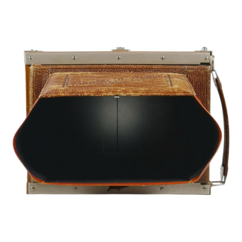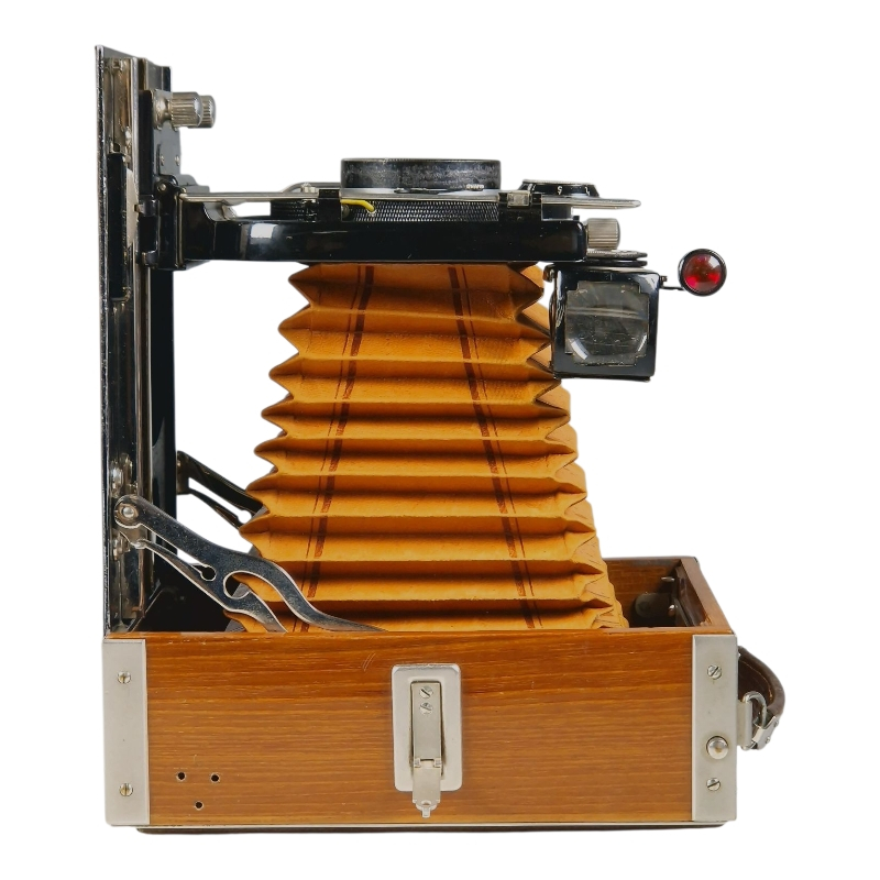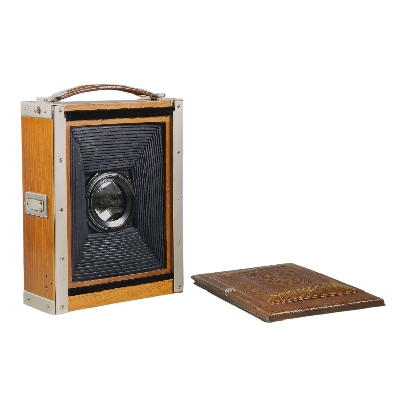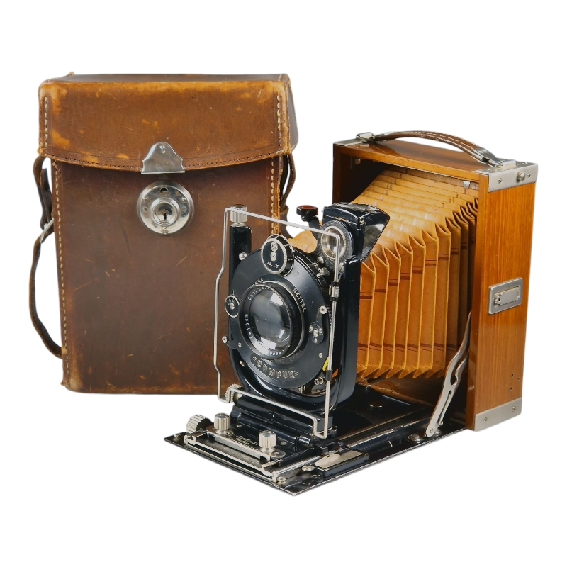 1920-luvun tiikkikuorinen "trooppinen" 9x12 paljekamera. Compur-suljin huollettu 09/2025, kaikki ajat kunnossa ja kohdillaan. Linssinä siisti Zeiss Jenan Tessar 15cm f/4.5. Hieman ulkoista käytön ja ikääntymisen jälkeä, yleisilme on miellyttävä. Tähyslasin reunalta puuttuu pieni pala, ei haittaa käyttöä. Alkuperäinen nahkalaukku mukana. Hieno!