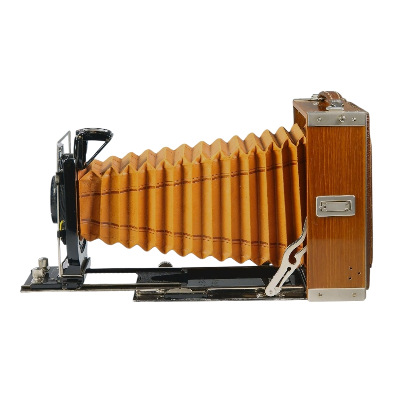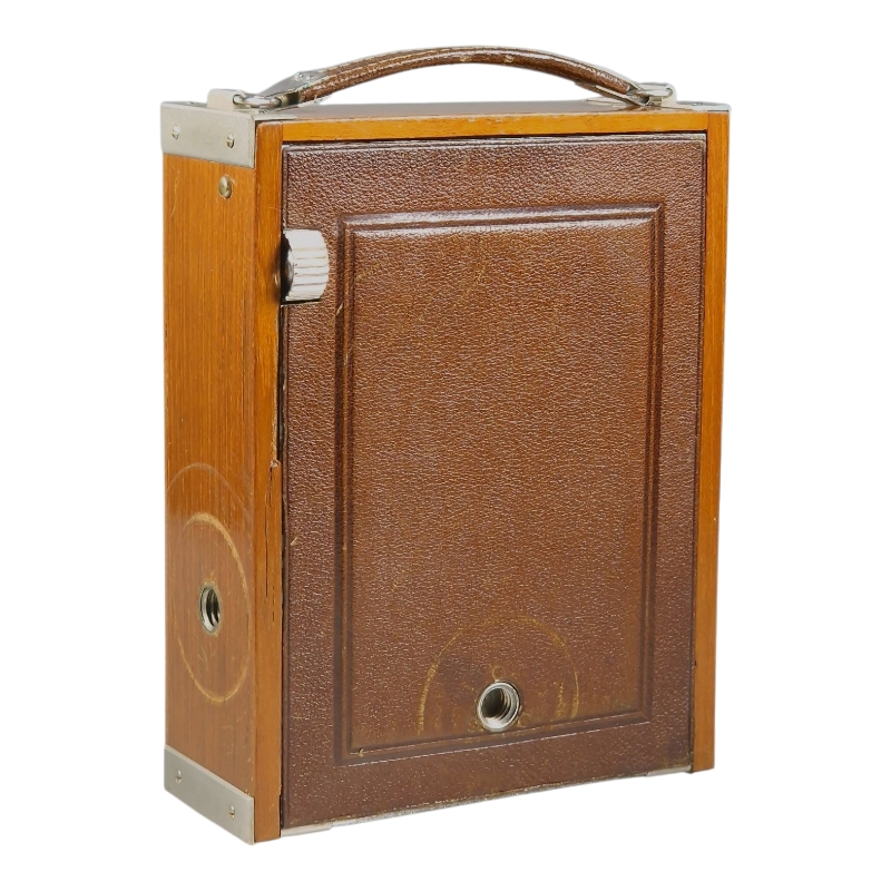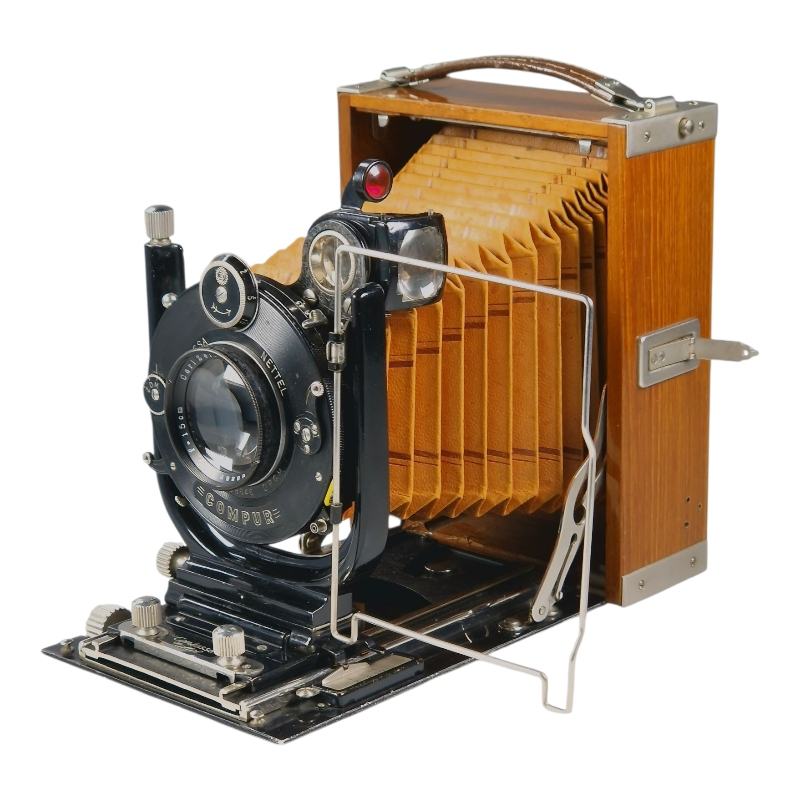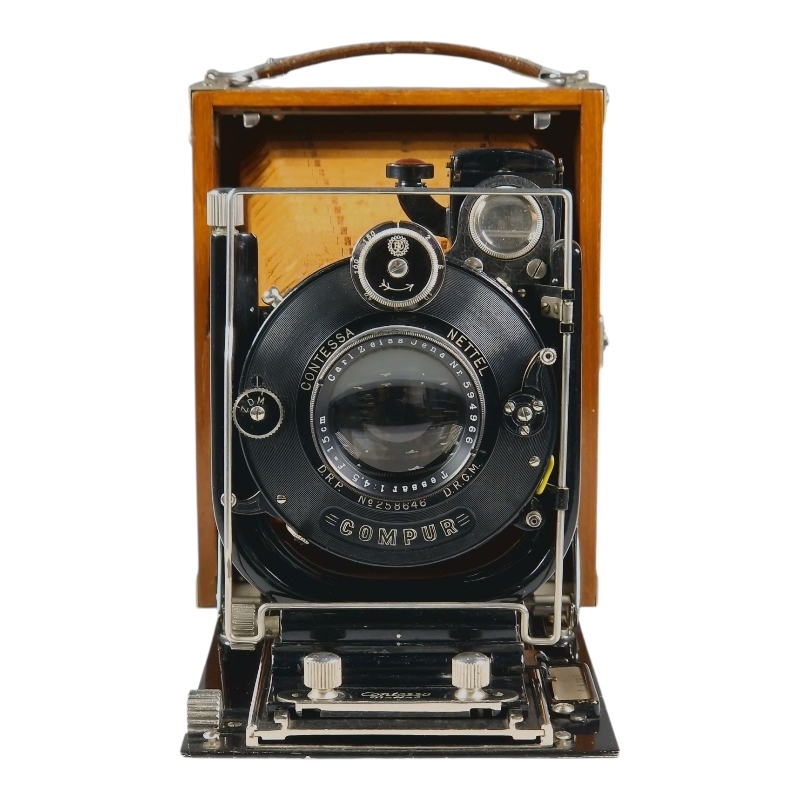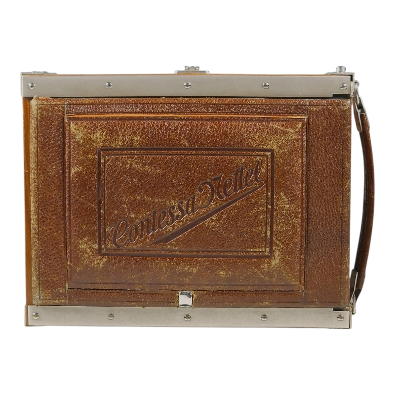 1920-luvun tiikkikuorinen "trooppinen" 9x12 paljekamera. Compur-suljin huollettu 09/2025, kaikki ajat kunnossa ja kohdillaan. Linssinä siisti Zeiss Jenan Tessar 15cm f/4.5. Hieman ulkoista käytön ja ikääntymisen jälkeä, yleisilme on miellyttävä. Tähyslasin reunalta puuttuu pieni pala, ei haittaa käyttöä. Alkuperäinen nahkalaukku mukana. Hieno!
