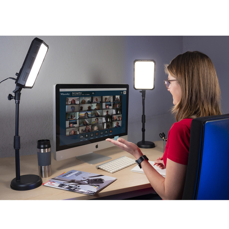 Kaksi LED-valaisinta säädettävällä teholla ja värilämpötilalla. Luovat tasaisen pehmeän valon, joka sopii erityisen hyvin muotokuviin, haastatteluihin, sisällöntuotantoon, vloggaamiseen, videoneuvotteluihin, webinaareihin, vauva- ja lastenkuvaukseen, sekä tuotekuvaukseen tai makrokuviin. Mukana korkeussäädettävät pöytäjalustat pyöreällä alustalla.