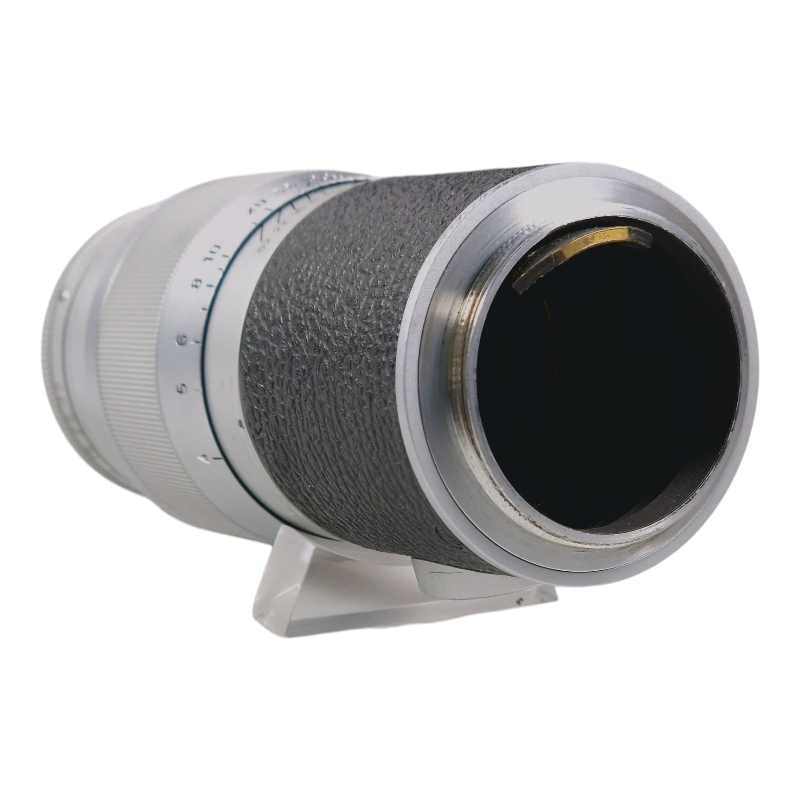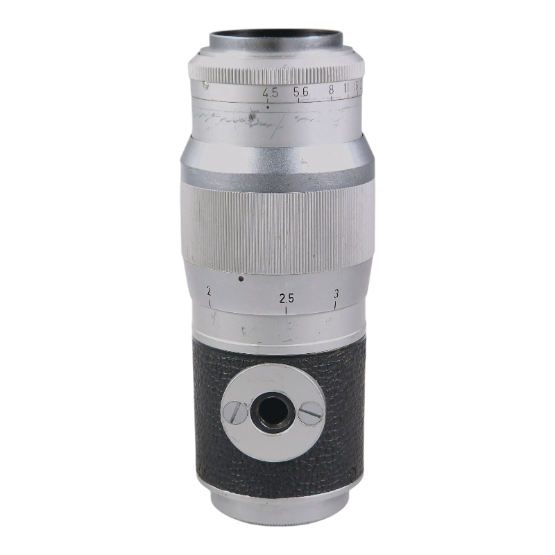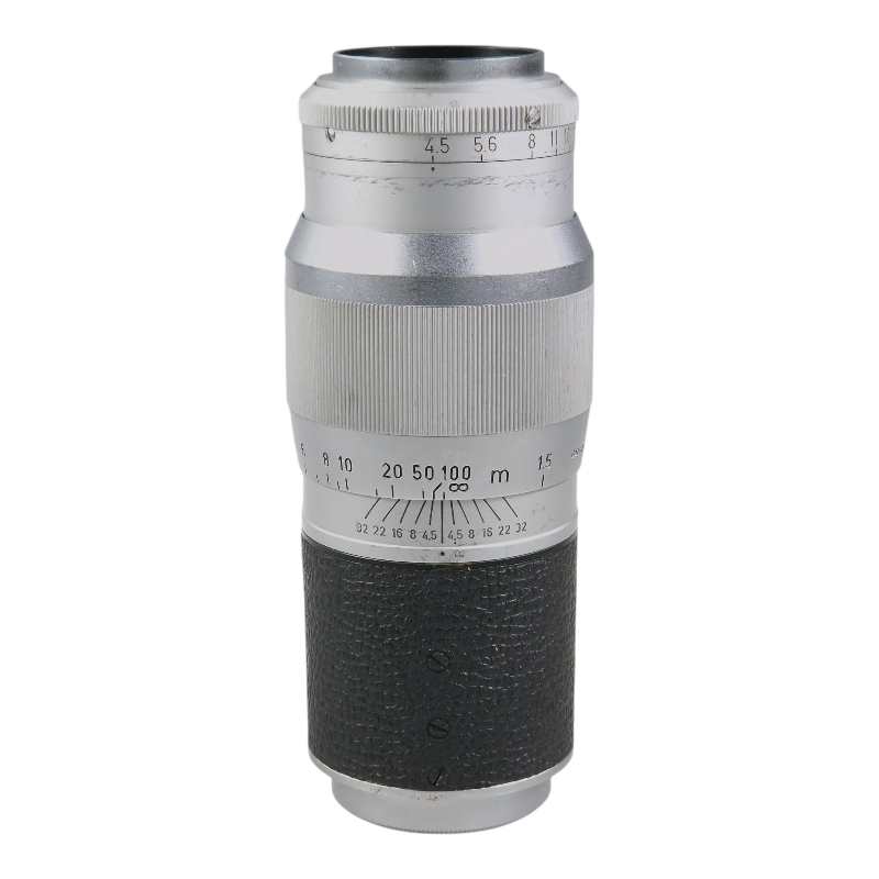 Pikkutele Leica-kierrekiinnityksellä vm. 1954. Normaalia ulkoista käytön jälkeä. Tarkennus on hieman epätasainen, kuitenkin täysin käyttökelpoinen. Optiikka puhdistettu, aivan hentoinen utu vielä havaittavissa, kuitenkin kuvauskunnossa. Yhden linssiryhmän aivan reunalla havaittavissa vähäistä separaatiota, tämäkään ei piirtoa haittaa. Takasuoja mukana.