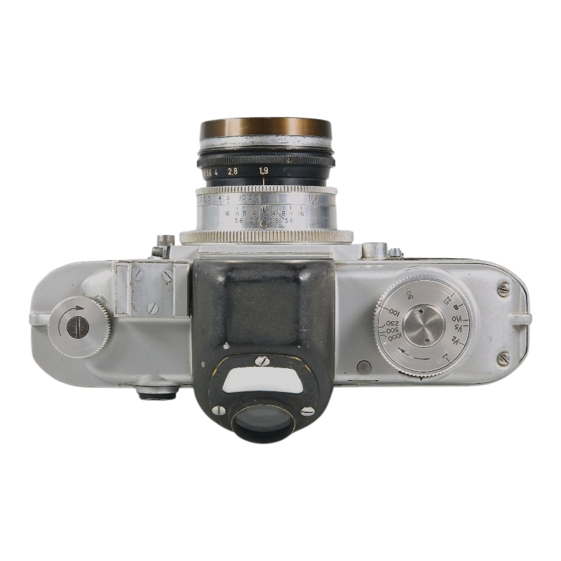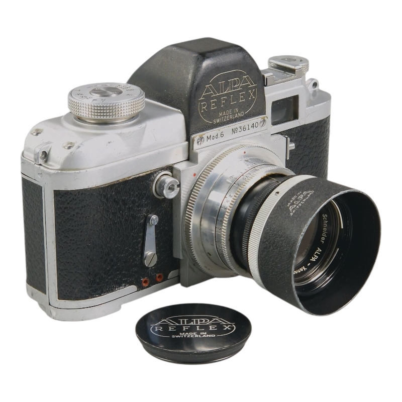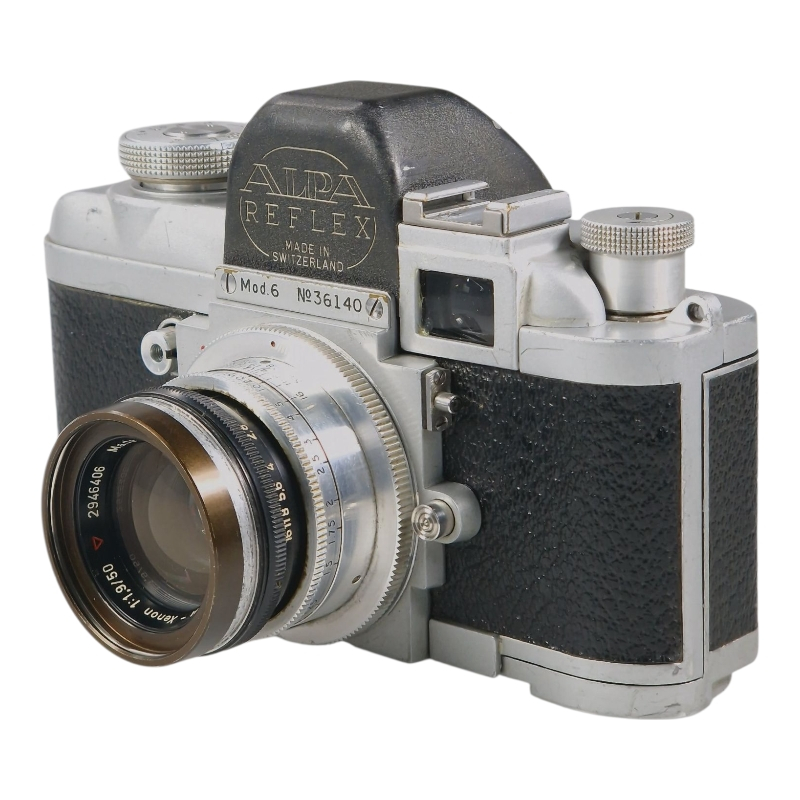 Tyylikäs ja omalaatuinen 1950-luvun SLR-kamera, sveitsiläistä käsityötä. Optiikkana harvinaisempi Schneider Alpa-Xenon 50mm f/1.9. Suljinajat 1s-250s kaikki kunnossa, 1/500s alivalottaa hiemani, 1/1000s ei toimi. Xenon puhdistettu, mutta osa utuisuudesta on pysyvää, kuitenkin kuvauskunnossa. Alkuperäiset linssinsuoja ja vastavalosuoja mukana.