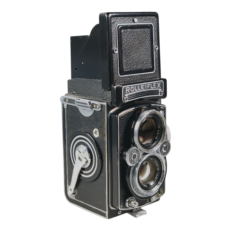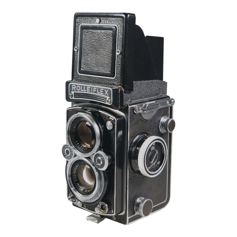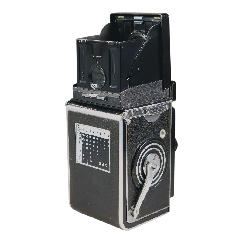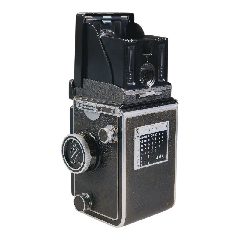 Rollein kaksisilmäinen 1950-luvulta 75mm f/3.5 Carl Zeiss Planar -objektiivilla. Vuosihuollettu. Suljinajat kaikki kohdillaan, filminsiirto ja ruutuvälit kunnossa. Planarin etulinssin keskellä on pieni naarmu, myös kevyempää puhdistusjälkeä. Kuitenkin täysin kuvauskunnossa. Suljinajan valintakiekko ehkä aavistuksen jäykkä. Normaalia käytön jälkeä.