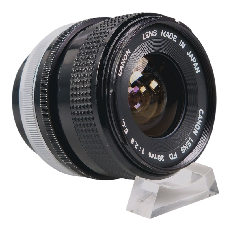 Canon FD -laajakulma ulkoisesti hieman kuluneessa, mutta erinomaisessa optisessa ja mekaanisessa kunnossa. Optiikka on siisti ja naarmuton. Tarkennus on sulava ja tasainen. Himmennin on puhdas ja napakka. Linssinsuojat mukana.