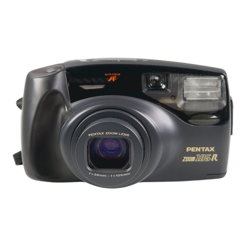 Pentax-kompaktikamera 38-105mm zoomilla. Erinomaisessa ja täydessä toimintakunnossa. Laadukasta tekoa. Vain kevyttä ulkoista käytön jälkeä. Hihna ja suojakotelo mukaan.