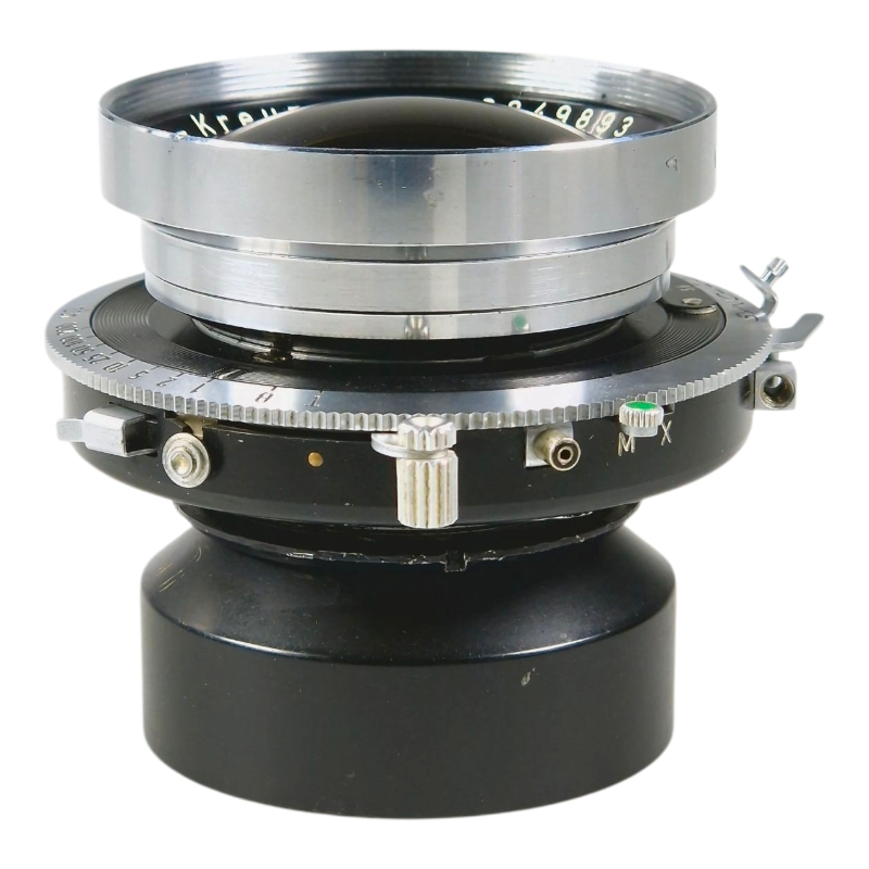 Schneiderin isoformaattilinssi Synchro-Compur-sulkimella. Optiikka on siisti, kirkas ja naarmuton. Sulkimen ajat kaikki hienosti kohdillaan. Himmentimen säätörenkaan takana jälkiä edellisen omistajan DIY-kokeiluista, vaiva on vain kosmeettinen. Piirtoympyrää piisaa 5x7 asti. Etuelementit poistamalla toimii myös 370mm f/12 linssinä.