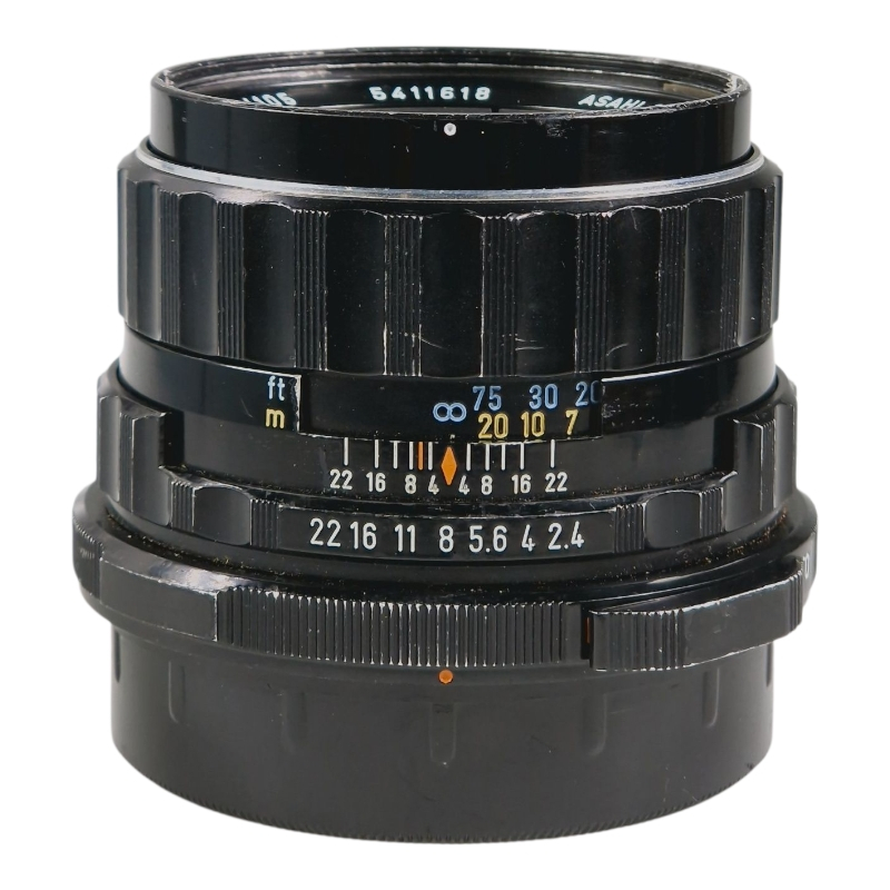 Valovoimainen normaaliobjektiivi Pentaxin 6x7-kameroille. Tarkennus on sulava ja tasainen, himmennin on öljytön ja napakka. Optiikka on siisti ja naarmuton. Ulkoista käytön jälkeä ja kulumaa löytyy. Alkuperäiset linssinsuojat mukana.