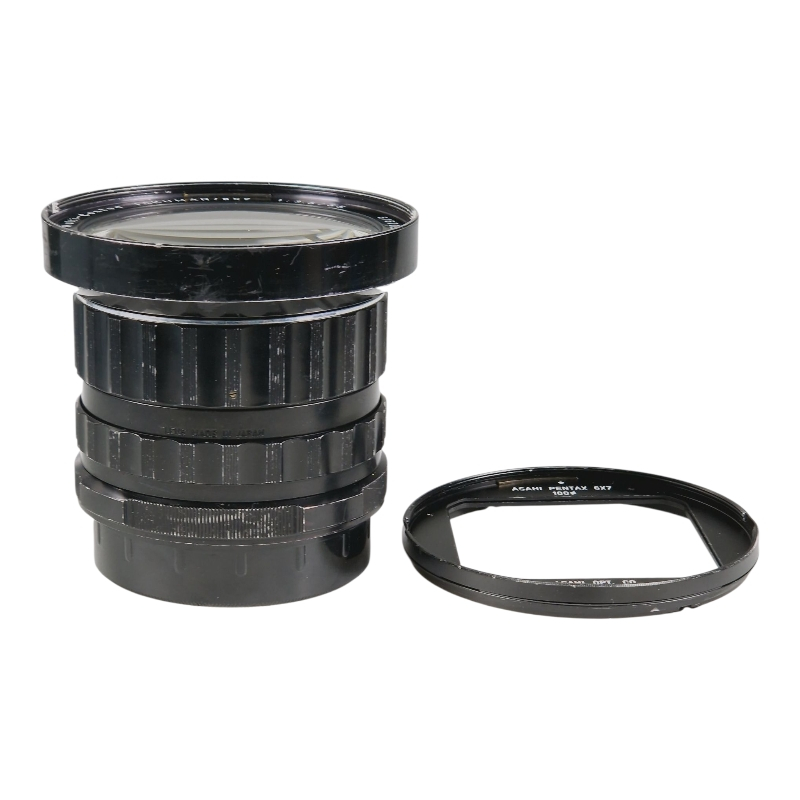 Laajakulma Pentaxin 6x7-kameroille. Tarkennus on sulava ja tasainen, himmennin on napakka. Etulinssissä joitain kevyitä puhdistusjälkiä, näillä ei vaikutusta piirtoon. Muutoin optiikka on siisti. Ulkoista käytön jälkeä ja kulumaa löytyy. Mukana alkuperäiset linssinsuojat ja Gelatin Filter Frame.
