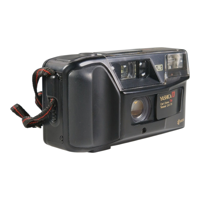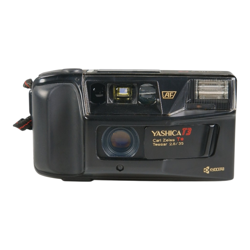 Skarpilla 35mm f/2.8 Carl Zeiss T* Tessar -objektiivilla varustettu filmikompakti. T3:n "kuiluetsin" mahdollistaa kuvan sommittelun vaikka vyötärötasolta. Erinomaisessa ja täydessä toimintakunnossa. Valotus ja tarkennus tarkistettu huoltomme testilaitteistolla. Normaalia kosmeettista käytön jälkeä, yleisilme on miellyttävä. Hihna mukana.