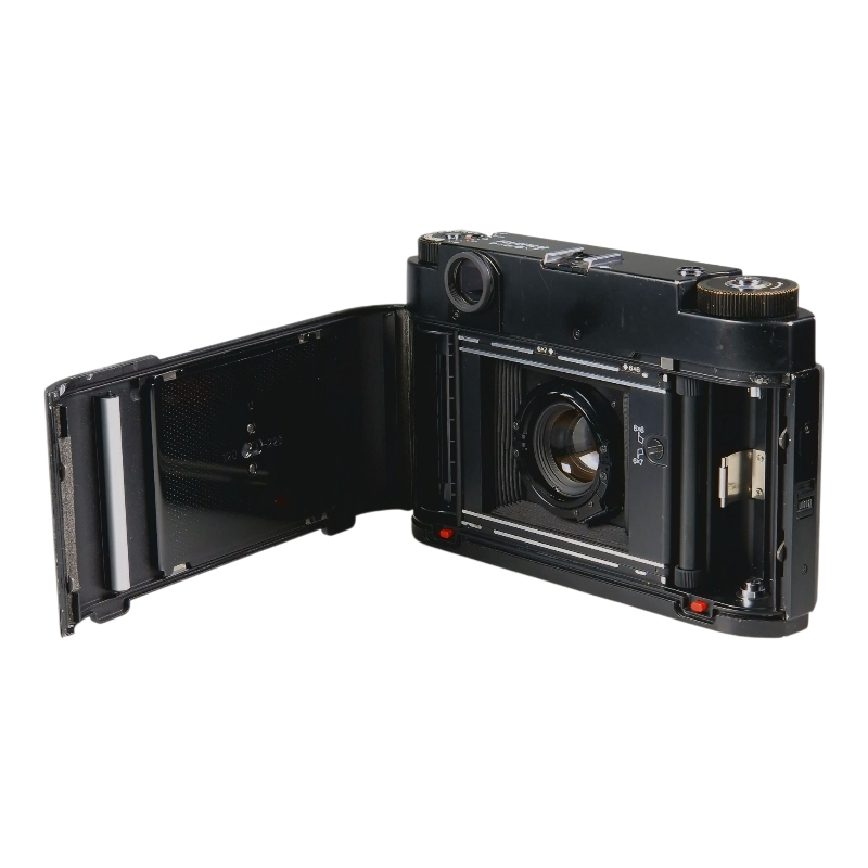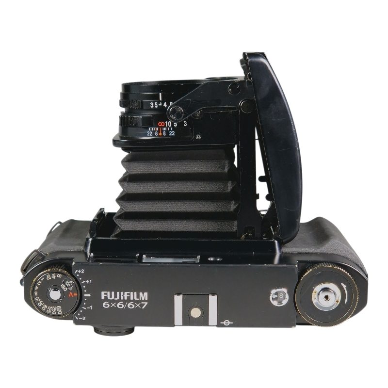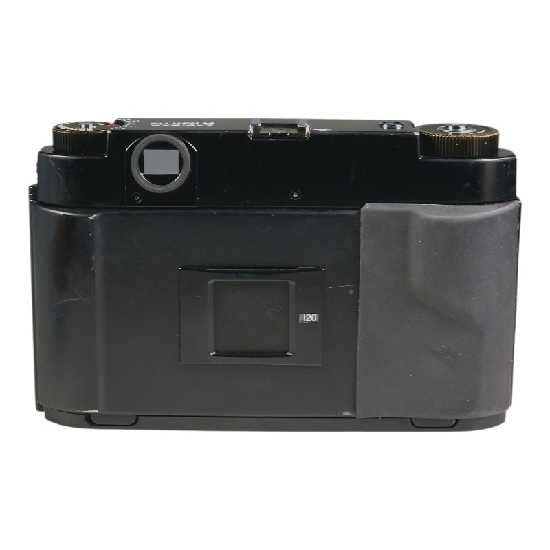 Moderni keskiformaatti-rangefinder, kuvaa 6x7 tai 6x6 ruutua 120- tai 220-filmille. Linssinä skarppi 80mm f/3.5 EBC Fujinon. Manuaalivalotus tai aukon esivalinnan automatiikka. Ulkoista kulumaa löytyy. Huolellisesti testattu huollossamme. Palje uusittu. Valotiivisteet uusittu. Linssi on siisti ja naarmuton. Tarkennus ja valotus ovat kohdillaan, mittaetsin on säädetty. Testattu myös filmillä.