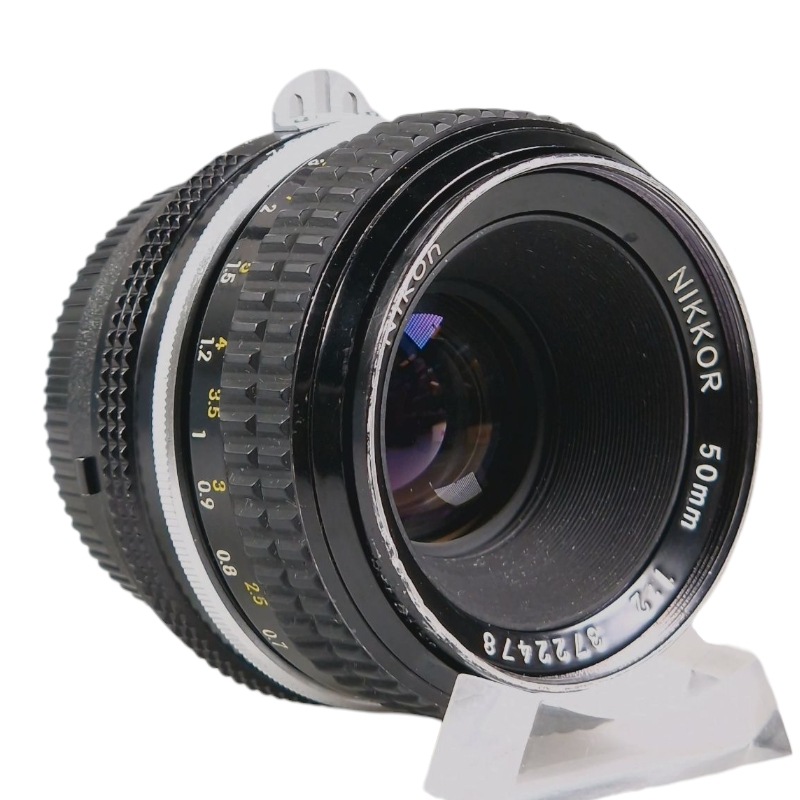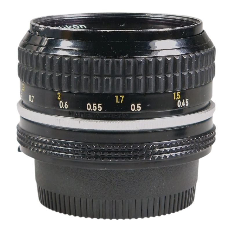 Nikkor-normaalilinssi ulkoisesti kuluneessa, mutta optisesti hyvässä kunnossa. Tarkennus on hieman kuivakka, mutta säätyy tasaisesti ja ilman välystä. Himmennin on öljytön ja napakka. Optiikka on siisti, kirkas ja naarmuton. Suodinkierteissä pientä vauriota, mutta suotimen saa paikalleen. Linssinsuojat mukaan.