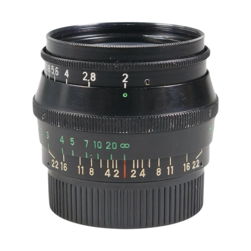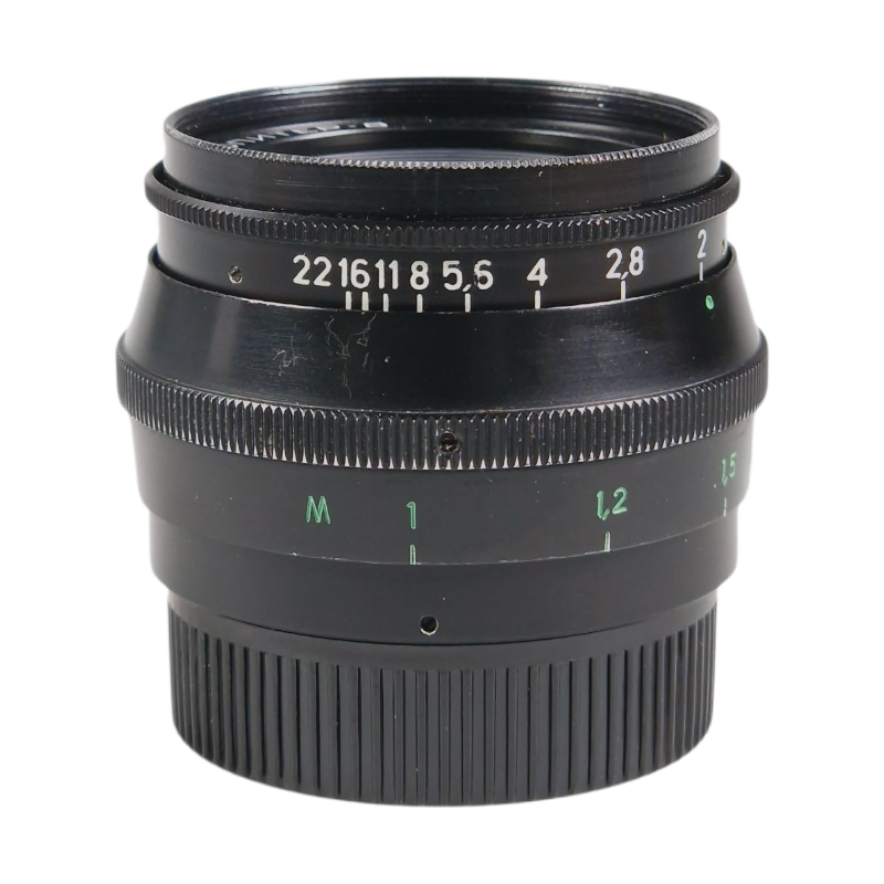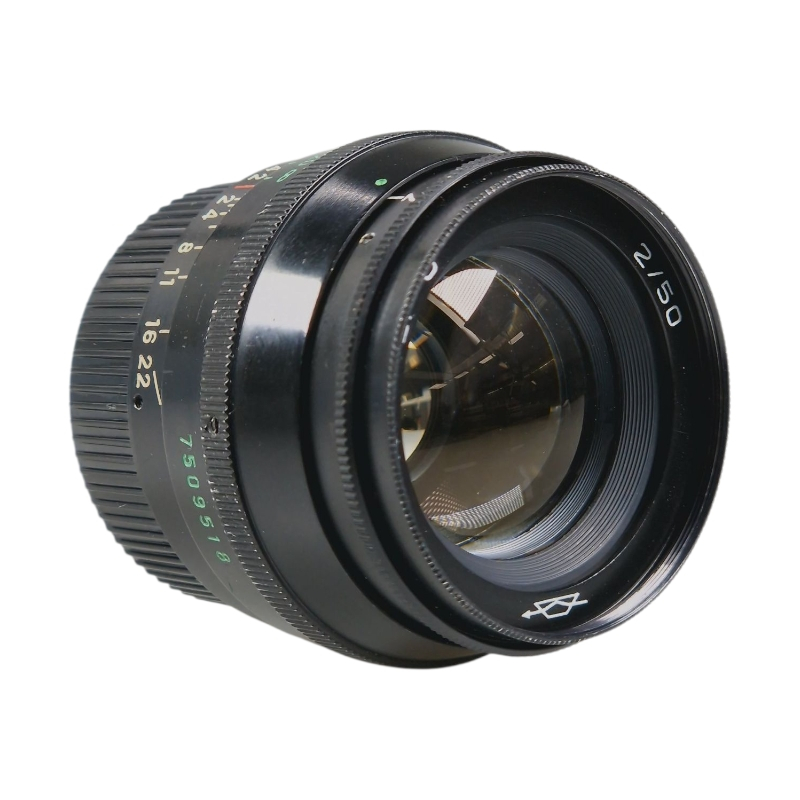 KMZ:n kopio 5cm f/2 Carl Zeiss Jena Sonnar -linssistä, Leica-kierrekiinnityksellä. Tarkennus on sulava ja tasainen. Himmenninlehdillä pieniä öljyjälkiä, mutta himmennin liikkuu vapaasti ja säätyy miellyttävästi. Optiikka on kirkas, siisti ja naarmuton. Objektiivin takasuoja mukana.