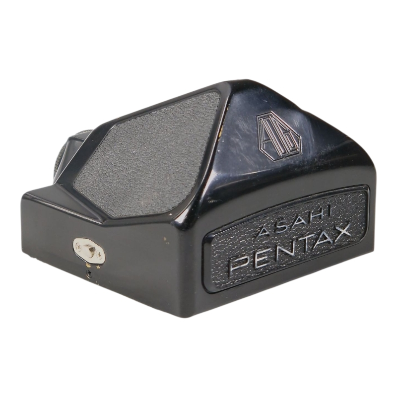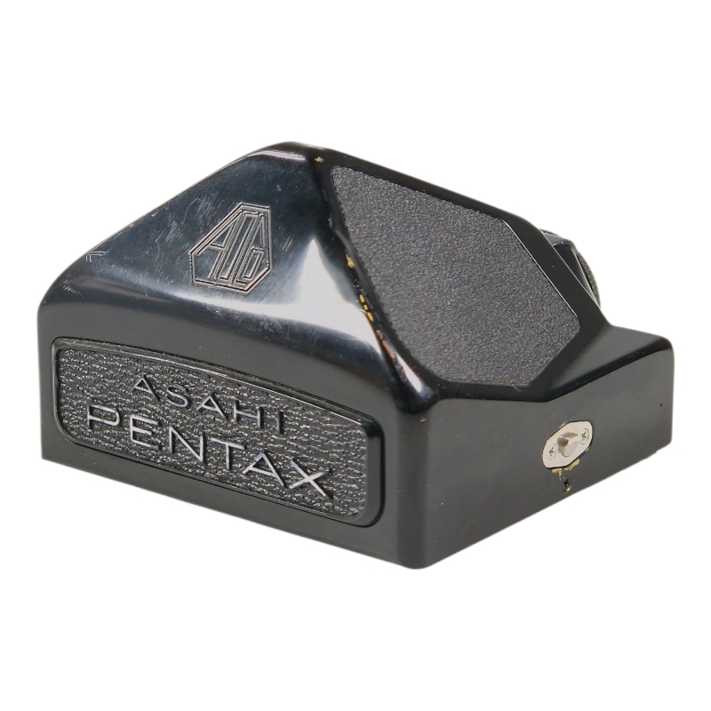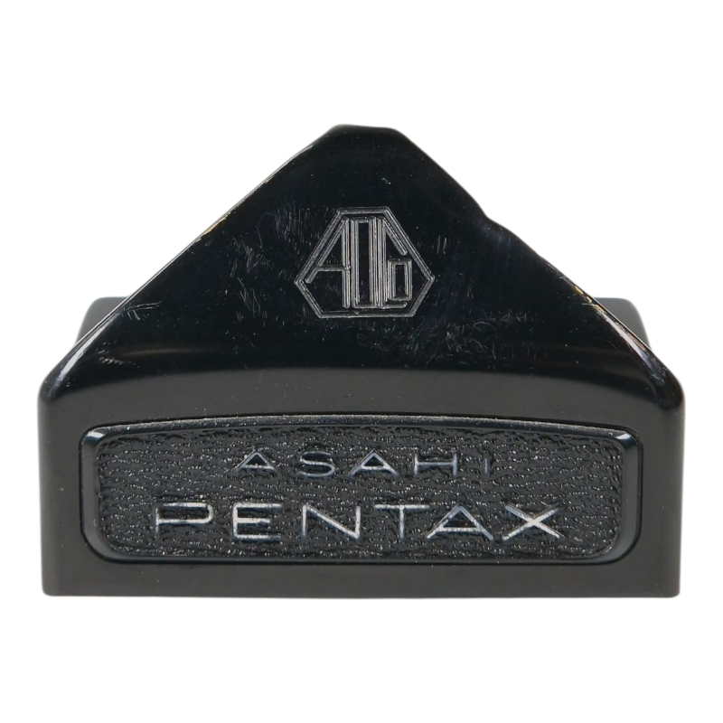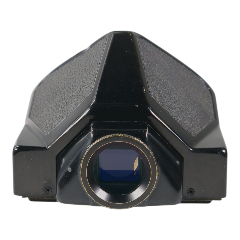 Perusprisma Pentax 6x7 -kameroille. Pari pientä lommoa prisman yläkuoressa. Muutoin normaalia käytön jälkeä. Etsinkuva on kirkas ja selkeä. Pehmusteet uusittu.