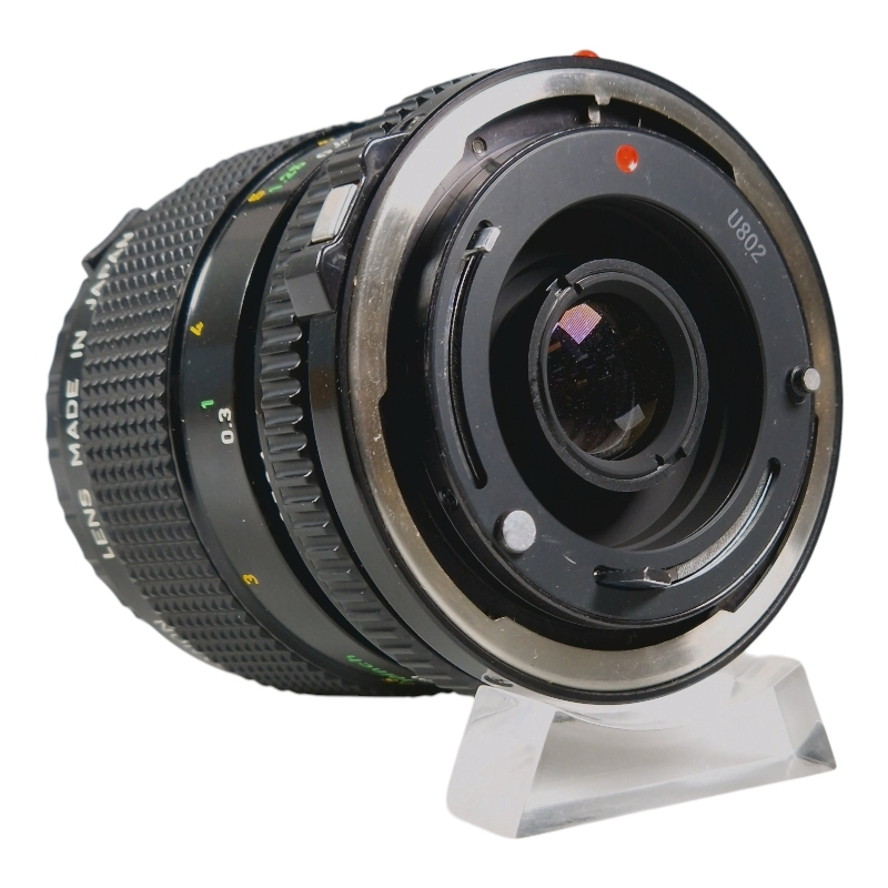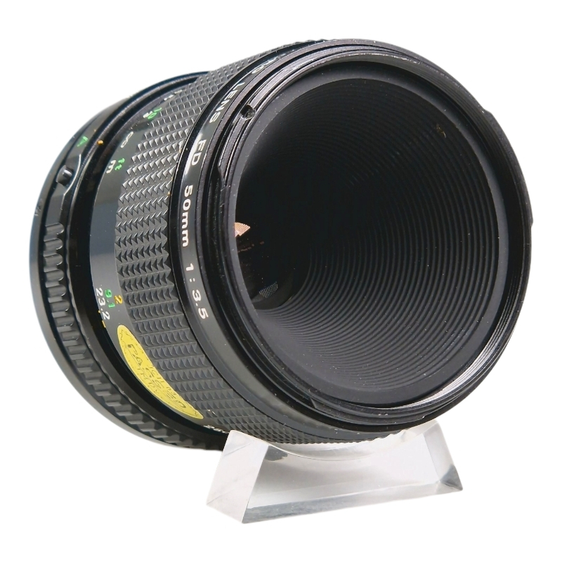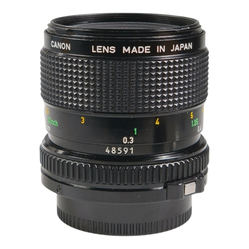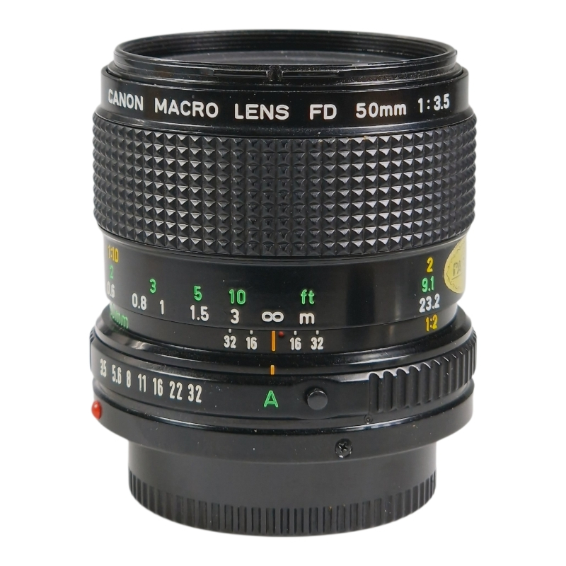 Canon FD makro-objektiivi erinomaisessa kunnossa. Tarkennus on sulava ja tasainen, himmennin on puhdas ja napakka, optiikka on siisti ja naarmuton. Vain kevyitä ulkoisia käytön jälkiä. Linssinsuojat mukana.