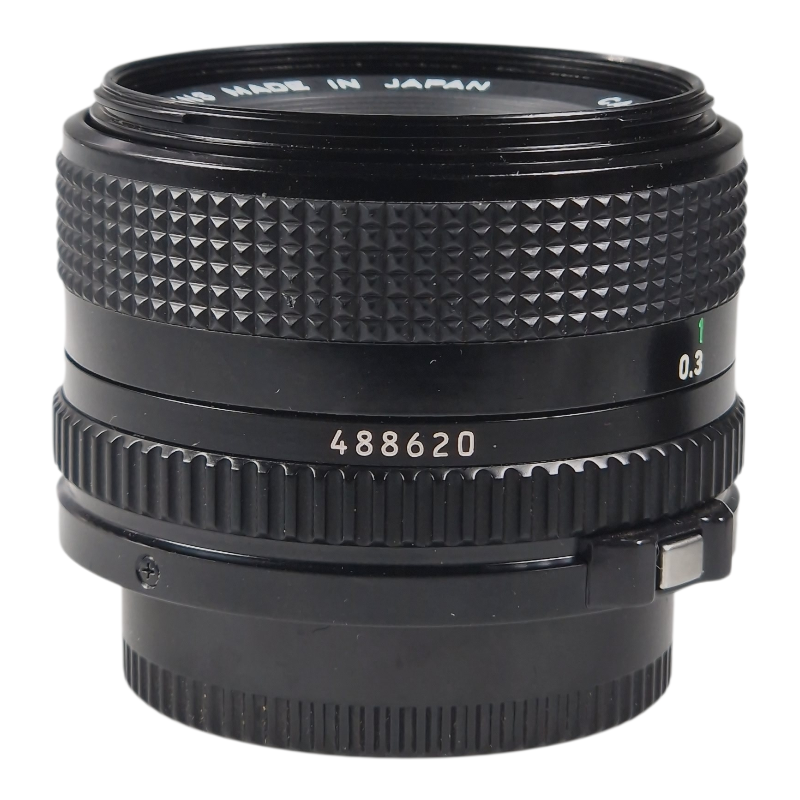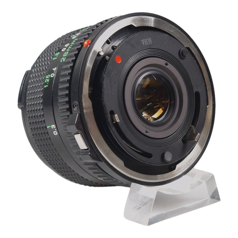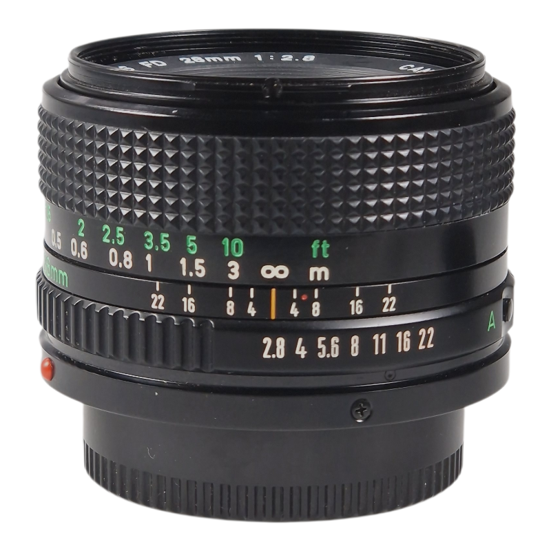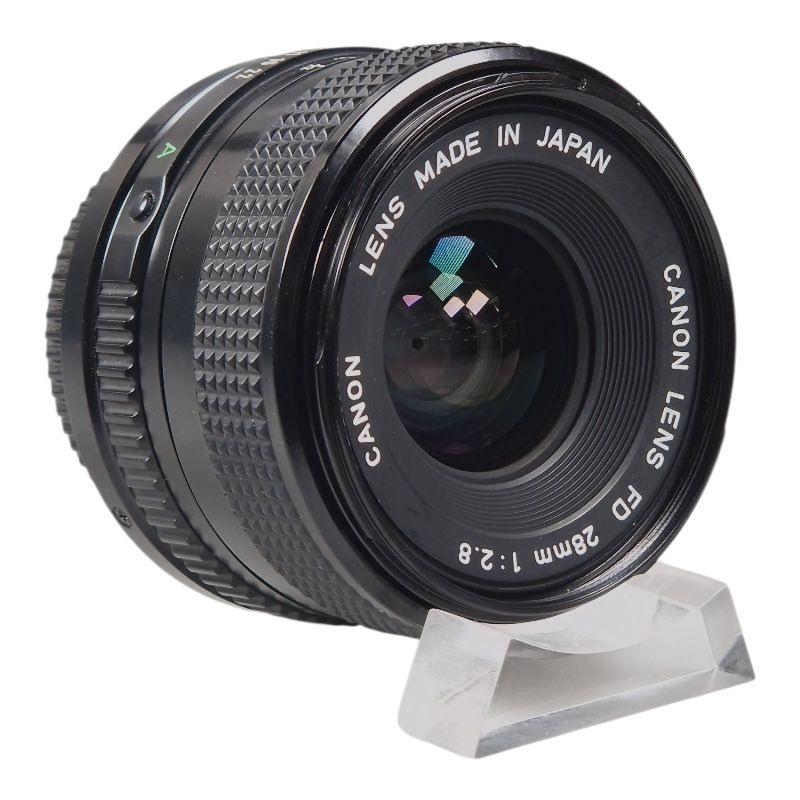 Canon FD laajakulma mainiossa kunnossa. Tarkennus on sulava ja tasainen, himmennin on öljytön ja napakka. Optiikka on siisti, vähäpölyinen ja naarmuton. Vain kevyttä kosmeettista käytön jälkeä, yleisilme on siisti. Mukana alkuperäiset Canon-linssinsuojat.