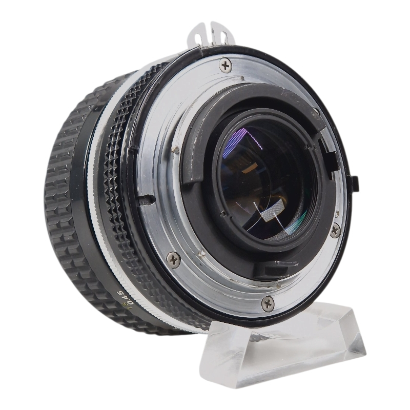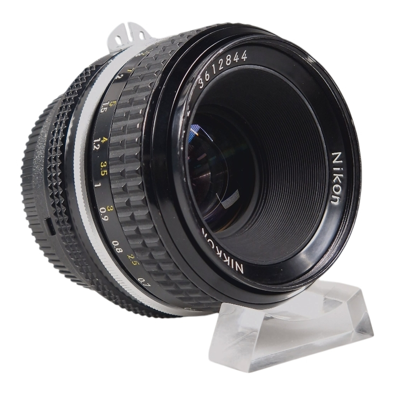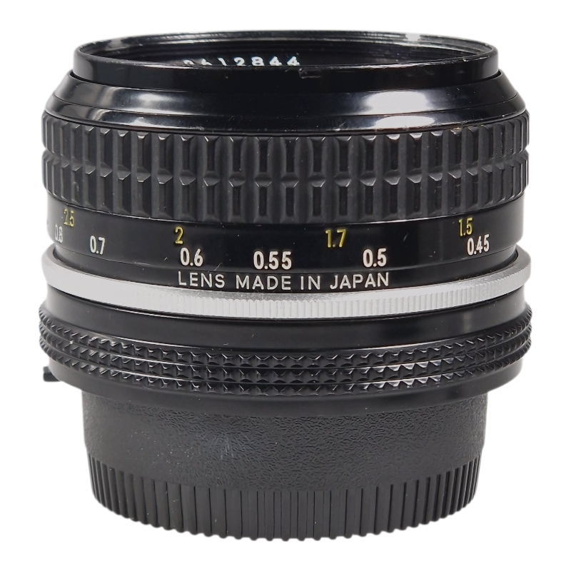 Nikkor-normaalilinssi erittäin hyvässä kunnossa. Tarkennus on hieman kuivakka, mutta säätyy tasaisesti ja ilman välystä. Himmennin on öljytön ja napakka. Ei liiallista pölyä optiikassa, linssipinnat ovat naarmuttomat. Suodinkierteissä pientä vauriota, mutta suotimen saa asiallisesti paikalleen. Objektiivin takasuoja mukana.