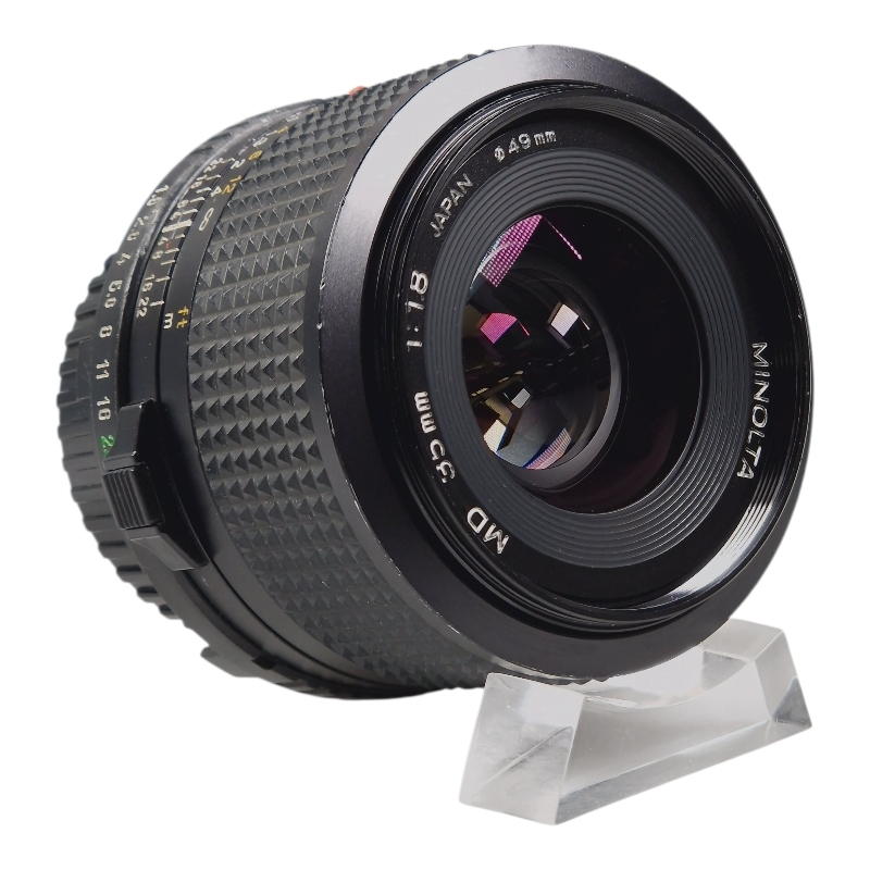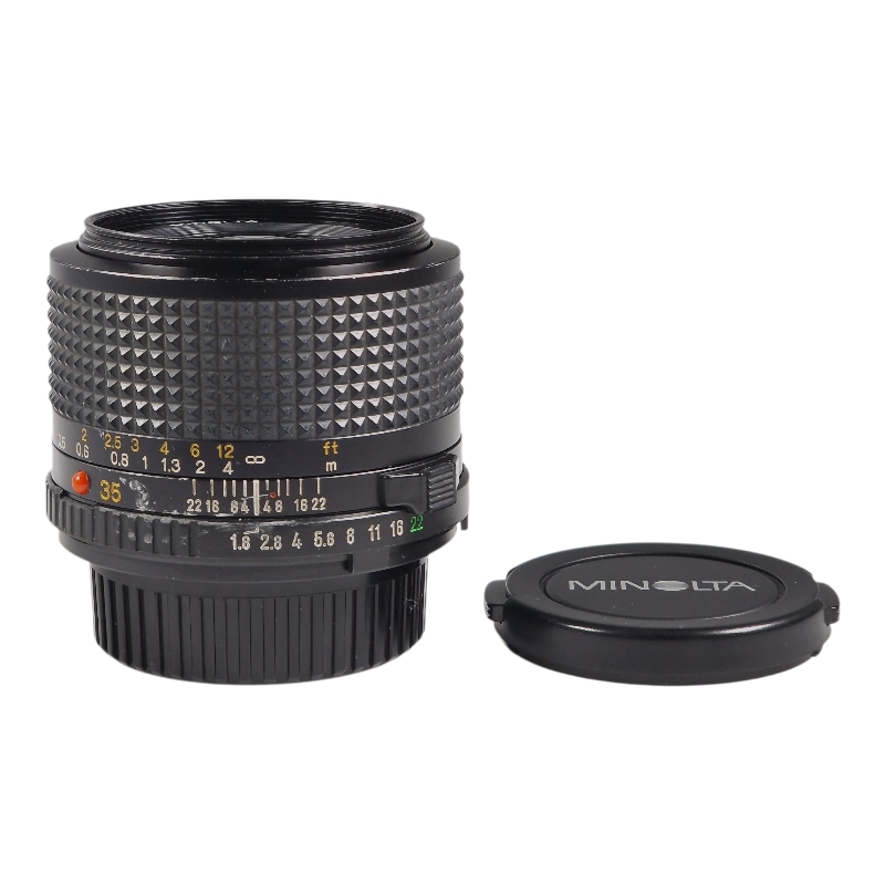 Valovoimainen semilaajakulma Minolta MD -kiinnityksellä. Tarkennus on sulava ja tasainen. Himmennin on puhdas ja napakka. Optiikka on kirkas, siisti ja naarmuton. Joitain käytön jälkiä ja suodinkierteissä pienen pieni painauma. Suotimen saa kuitenkin kierrettyä paikalleen. Mukana linssinsuojat.