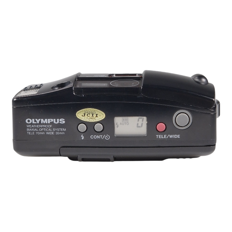 Olympuksen filmipokkari, jossa 35mm f/3.5 ja 70mm f/6.3 optiikat, joiden välillä pystyy valitsemaan näppärästi nappia painamalla. Automaattitarkennus, automaattivalotus, integroitu salama. Kamera on erinomaisessa ja täydessä toimintakunnossa. Normaalia ulkoista käytön jälkeä.