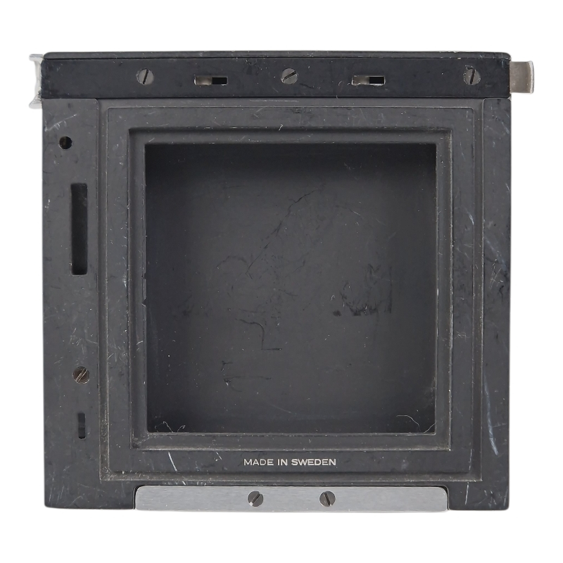 Suhteellisen harvinaiset Hasselbladin laakafilmiperä ja 3 kpl laakafilmikasetteja. Perässä käytön jälkeä, kasetit ovat hieman siistimmät. Kaikki erittäin hyvässä toimintakunnossa. Kaseteissa dark slidet mukana.