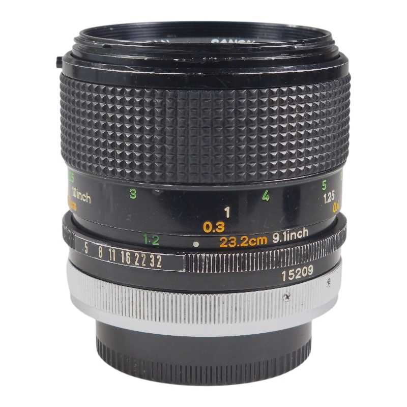Canon FD 1:2 makro-objektiivi. Optiikka on siisti ja naarmuton. Himmennin on puhdas ja napakka. Tarkennus on tasainen ja sulava. Kosmeettista kulumaa löytyy. 1:1 suurennos vaatii 25mm loittorenkaan objektiivin lisäksi.