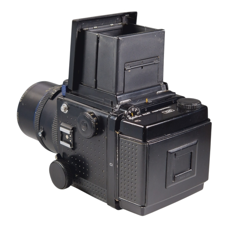 Keskiformaattityöjuhta 6x7 120-filmiperällä, kuiluetsimellä ja 180mm potrettilinssillä. Kokonaisuus huoltomme tarkistama ja puhdistama. Optiikka, mekaniikka ja valotus kaikki kohdillaan. 180mm on kirkas, naarmuton ja vähäpölyinen. Tuoreet valotiivisteet ja peilin pehmusteet. Normaalia kosmeettista käytön jälkeä.