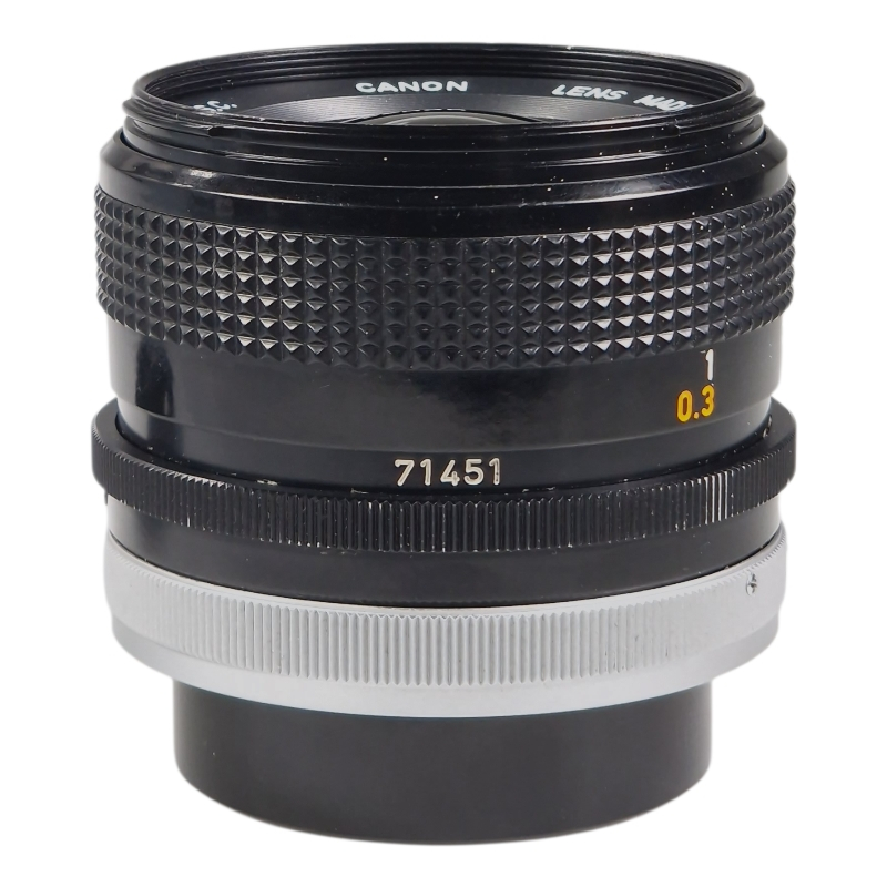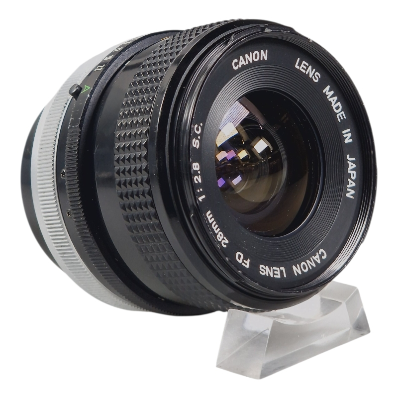 Canon FD -laajakulma. Tarkennus on hieman kuivakka, mutta säätyy tasaisesti. Etulinssillä joitain pienen pieniä pistemäisiä ja pintapuolisia jälkiä. Näillä ei ainakaan havaittavaa vaikutusta piirtoon. Muutoin optiikka on siisti ja naarmuton. Himmennin on puhdas ja napakka. Normaalia kosmeettista kulumaa.