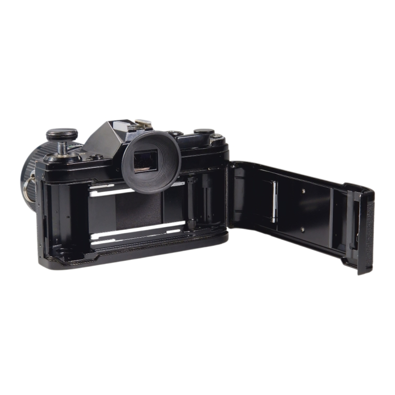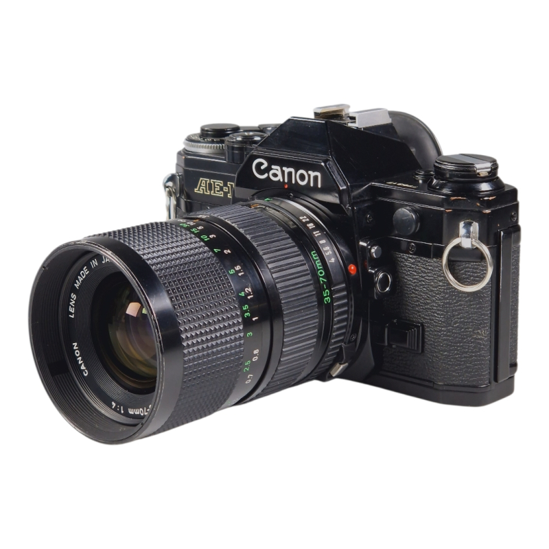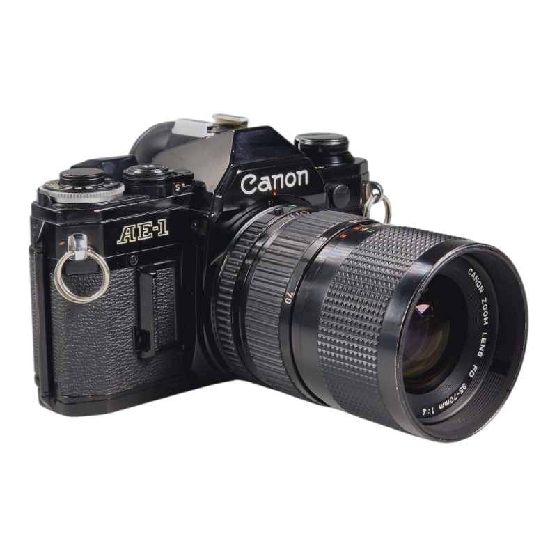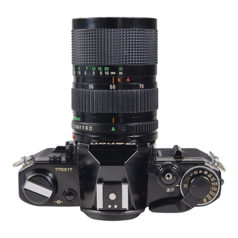 Canon FD -filmirunko 35-70mm zoomilla. Vuosihuollettu. Kamera ja linssi molemmat erinomaisessa ja täydessä toimintakunnossa. Uusitut valotiivisteet ja peilin pehmuste. Zoomin tarkennus on sulava, optiikka on siisti ja naarmuton. Normaalia kosmeettista käytön jälkeä.